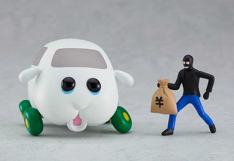 From the popular stop motion anime “Pui Pui Molcar” comes plastic model kits of the Molcars! Enjoy recreating the Molcars from the series with a simple assembly of the pre-colored parts. The model kit comes with two kinds of tire sets—a set to use for posing and a set that rolls. A bank robber figure (non-colored gray figure) is also included. Stickers for displaying Shiromo as though crying or sweating are included as well!