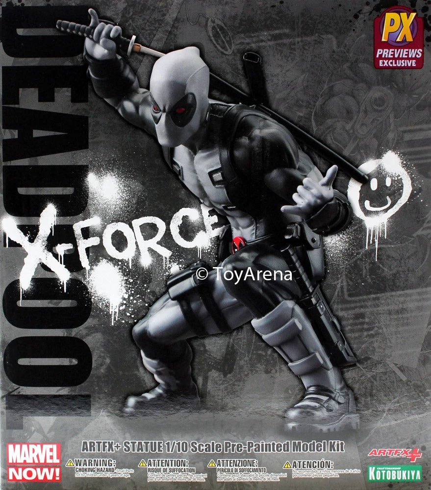 A KOTOBUKIYA Japanese import! X-Force cannot be stopped, and one of its most infamous members is back and looking great! Now that the Avengers lineup is complete, Kotobukiya is expanding its Marvel ARTFX+ line to other mainstream Marvel Comics characters. First up is one of the most popular comic book superheroes in the business in his mutant black ops team costume, DEADPOOL X-FORCE!