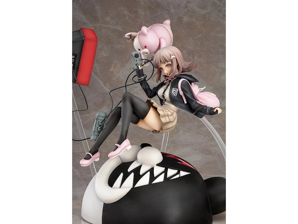 Her expression, pose, and intricate detail on even the smallest parts such as the controller have all been carefully sculpted to bring out Chiaki’s character. The base of the figure is made to look like Monokuma’s head, as if chasing the two of them as they float above him.